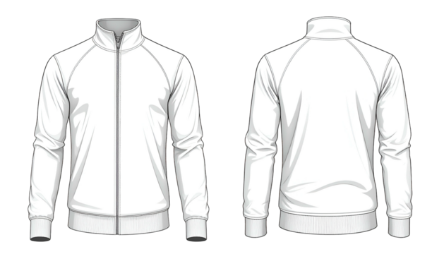 Front and back view illustration of a blank white track jacket with ribbed cuffs, collar, and hem