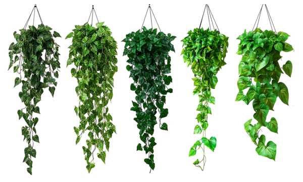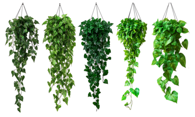 Five artificial hanging ivy plants, showcasing different shades and textures of green,  on islated transfarent background, PNG.