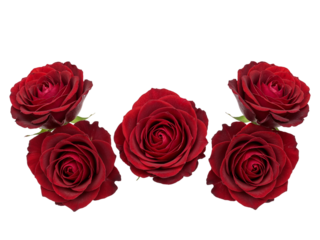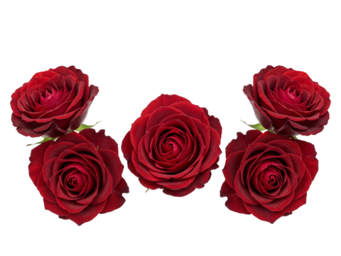 Five deep red roses arranged in a row with a dark background isolated on transparent background
