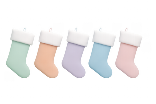 Five pastel colored christmas stockings hanging with transparent background