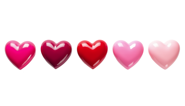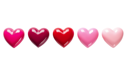 Five Glossy Hearts In Varying Shades Of Pink And Red isolated on a transparent background