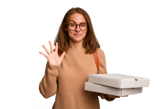Young student woman holding pizzas isolated smiling cheerful showing number five with fingers.