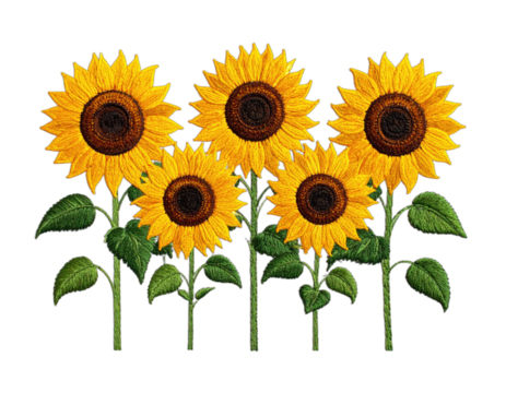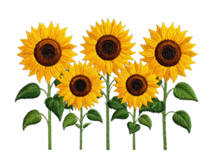 Five vibrant sunflowers against a black backdrop, showcasing their sunny yellow petals and dark centers