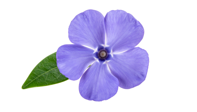 Close-up of a delicate, five-petaled, violet bloom with a single green leaf