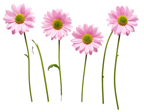 Close-up of five light pink daisies with green centers and stems