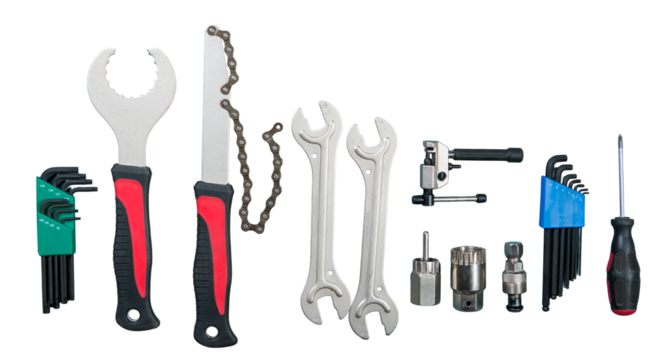 Silver wrench tightening a small gold spoke nipple on a bicycle rim on a transparent background