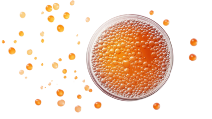 A vibrant fizzy drink in a glass surrounded by floating bubbles on a white isolated background.