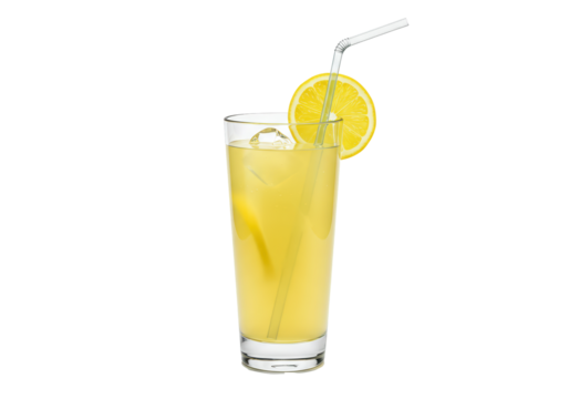Isolated glass of refreshing lemonade with straw and lemon slice for summer drink concept