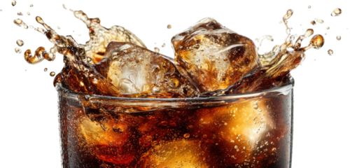 . PNGRefreshing fizzy drink splashing in a glass with golden bubbles isolated on a white background
