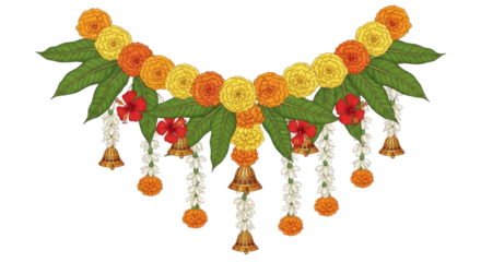 A colorful Indian floral decoration with marigolds and hibiscus flowers, hanging from a string with bells and hanging flowers, set against a png transparent.