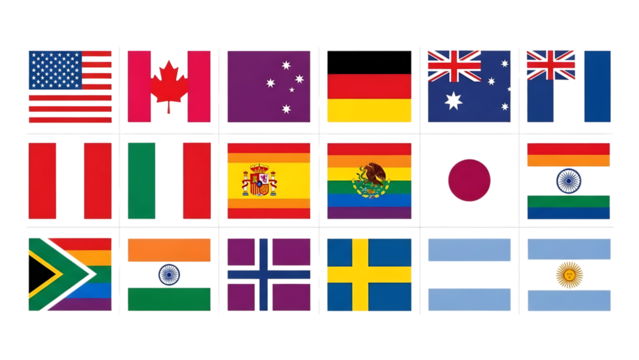 Collage of 16 national and pride flags from around the world set on a transparent background