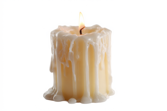 Burning candle with dripping wax isolated on white background for decoration and religious themes