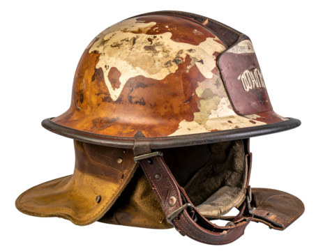 Old firefighter helmet from a fire