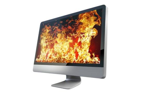 Computer on a fire isolated on transparent background