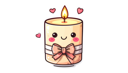 Cartoon candle with kawaii face, pink bow, hearts, and flames floating on a black background