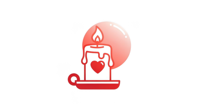 Stylized red candle with a heart design and melting wax on a holder, set against a soft pink background, symbolizing love and warmth.