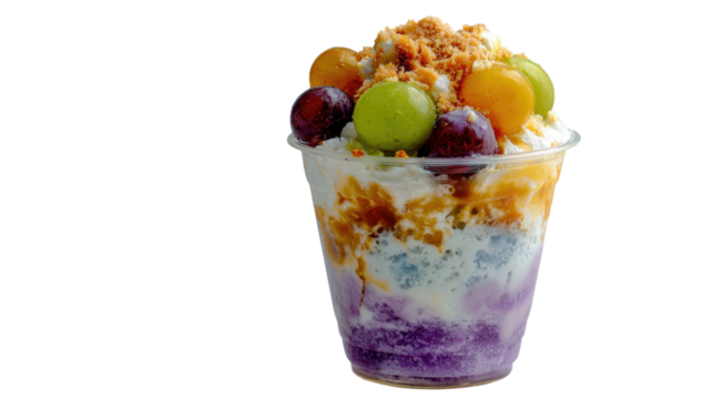 Colorful Filipino halo-halo dessert served in a glass, layered with shaved ice, fruits, jelly, ube, and leche flan topping