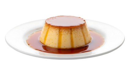A delicious flan dessert on a white plate with caramel sauce on transparent background