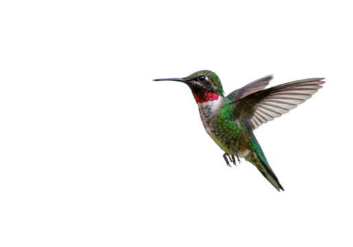 Isolated colorful Ruby-throated Hummingbird male flying mid-air flapping its wings outdoors