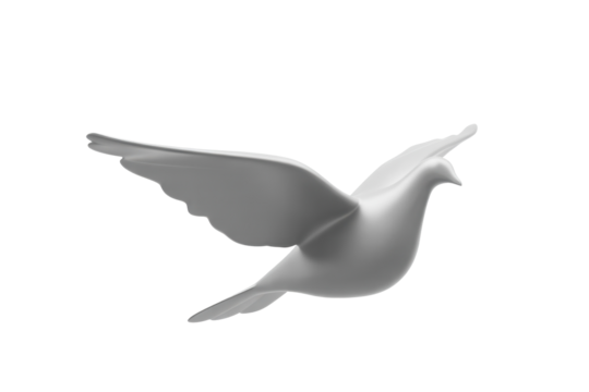 A white dove with outstretched wings flying against a black background in a studio setting shot frontally