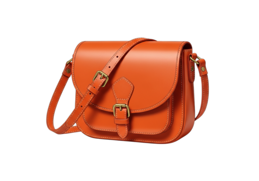 Classic orange leather satchel bag with a flap closure and adjustable strap isolated on transparent background