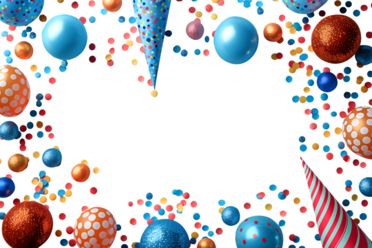 Creative party template. Party hat, streamer, confetti, glitter ornament, disco sequin ball on transparent background cutout, PNG file. Mockup template for artwork. Wallpaper banner. flat lay top view