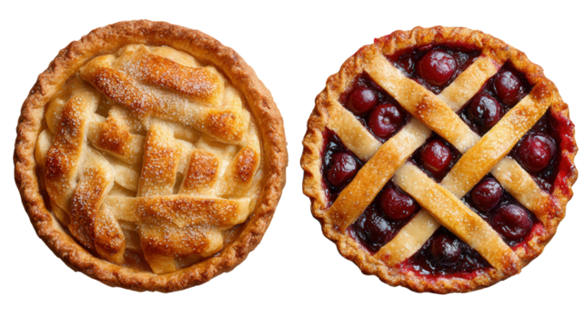 Freshly Baked Pies: A flat lay of freshly baked pies like apple and cherry, isolated on a Transparent background, PNG file.