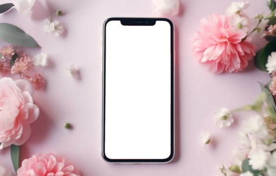 A modern smartphone with a blank white screen, isolated on a white background, viewed from a high angle.