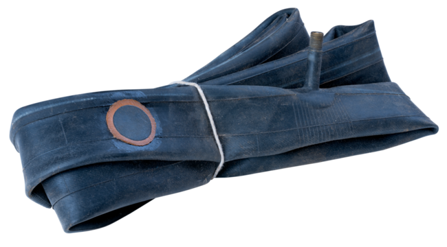 Bicycle inner tube rolled into a roll with a visible patch sealing the hole. Isolated background.