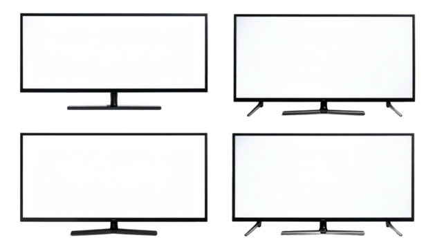 Four blank, modern flat-screen TVs are presented against a black background. The screens are all white and centered
