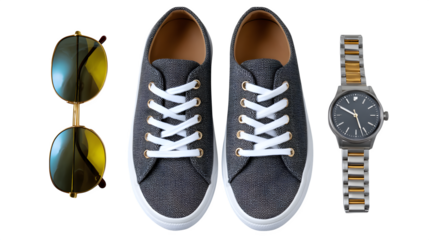 Men? casual sneakers next to a matching wristwatch and sunglasses, flat lay, white background,