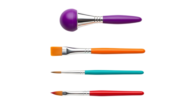 Set of four colorful paint brushes with different tips, isolated on transparent background