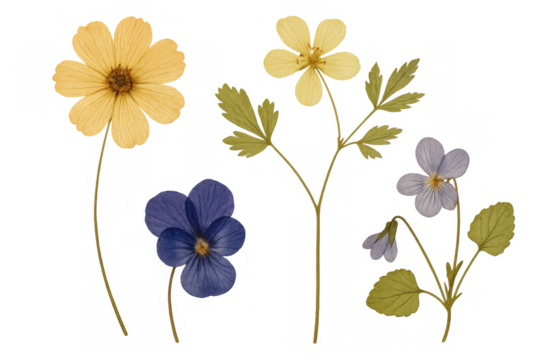 Vintage pressed flowers collection with gentle purple violet, yellow cosmos, and light buttercup blooms on transparent background