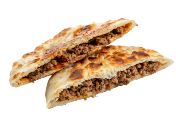 Beef-filled flatbreads served on a white background showcasing a delicious culinary creation