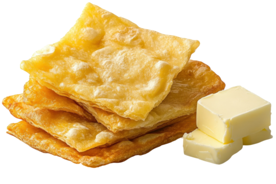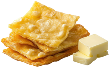 Crispy fried flatbreads served with a slab of creamy butter on a plain background