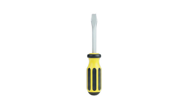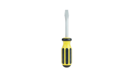 A flathead screwdriver with a black handle and yellow accent on transparent background