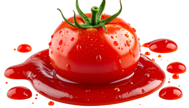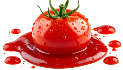 A ripe, red tomato sits atop a pool of red sauce with droplets and a black background
