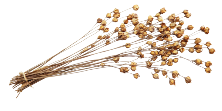 Dried flaxseed plant bundle with golden seed pods, perfect for rustic decor or natural crafts, displayed against a white background. on transparent background