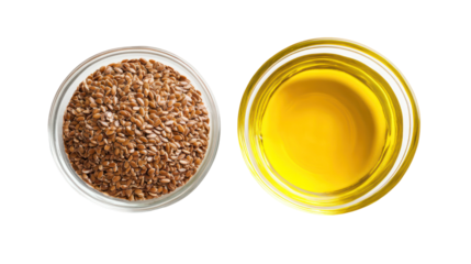 Flaxseeds and flaxseed oil in bowls isolated on transparent background