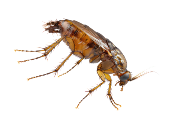 Close-up image of a flea on a white background, showcasing its detailed body structure and legs.