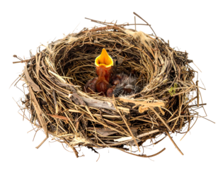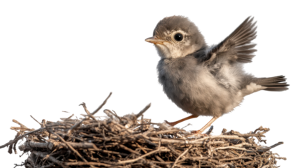 Tiny Bird in Nest: A fledgling bird perched on the edge of a nest, wings unfurled as it prepares to take its first flight, evokes a sense of anticipation and new beginnings.