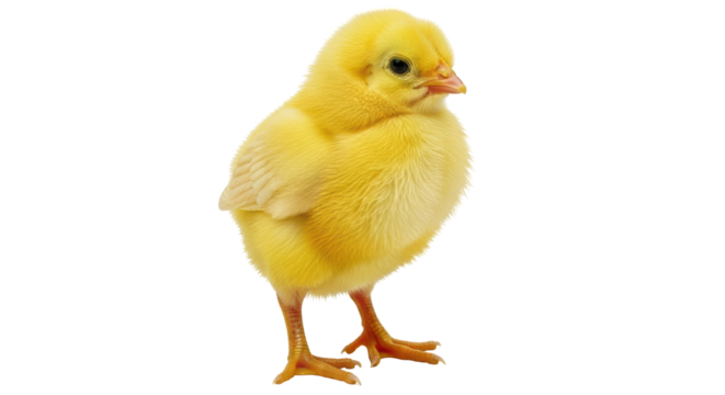 Tiny, fluffy yellow duckling stands, looking curious with orange feet and beak