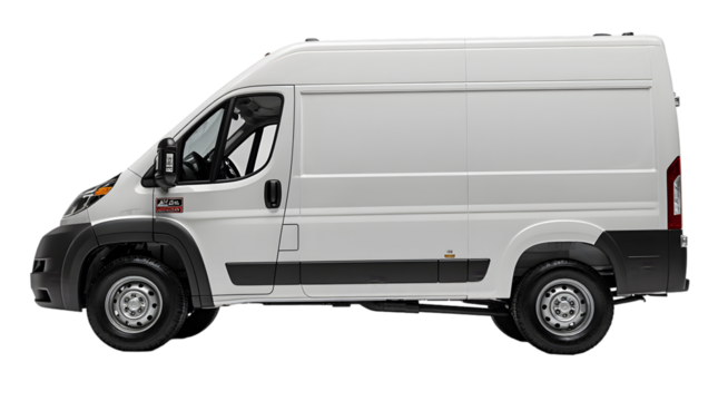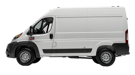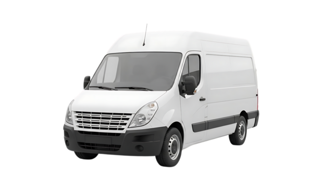 White delivery van parked on transparent background in a neutral setting with no distractions to focus on the vehicle's design and function
