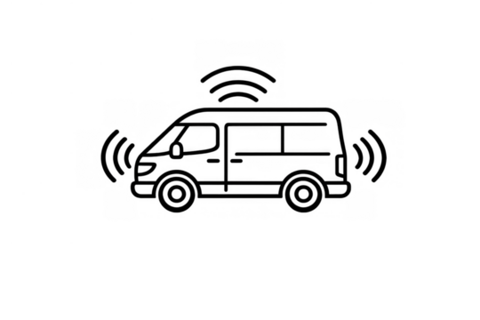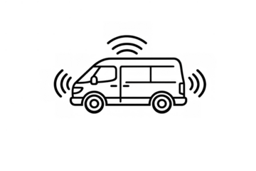 Autonomous delivery van line art icon emitting wireless signals, representing smart urban transportation and intelligent logistics