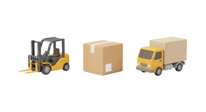 Miniature forklift and delivery trucks carrying packages on isolated transparent background