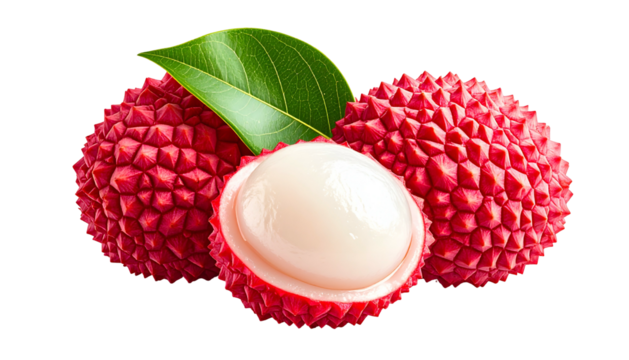 Three red, spiky tropical fruits with a green leaf and one fruit cut open, showing the white flesh