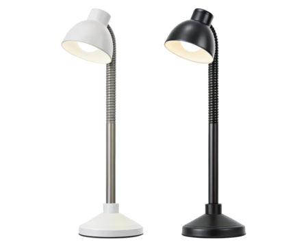 Adjustable desk lamps with flexible necks in black and white on a transparent background