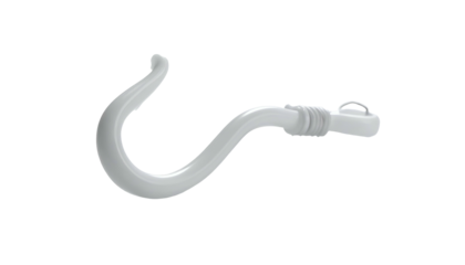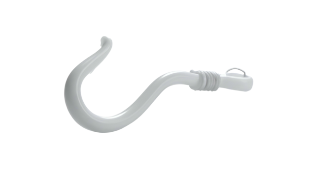 A white, curved, plastic tube with hook-like shape, isolated on a black background