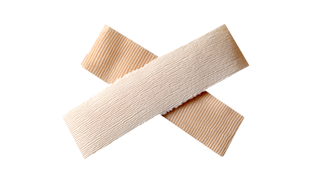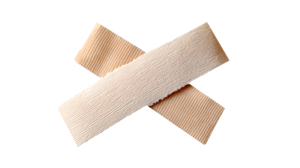 Two adhesive bandages crossed in X formation, tan fabric texture with center pads, serrated edges, isolated on a transparent background