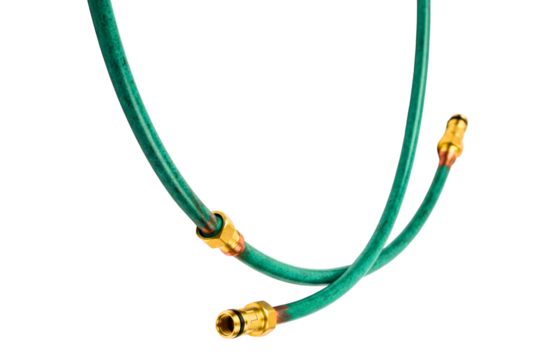 Green garden hose with brass connectors for watering plants isolated on transparent background